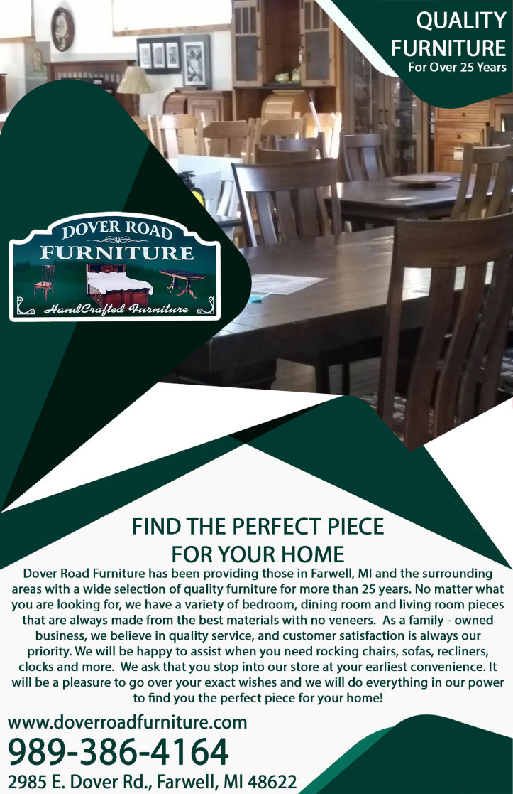 Dover Road Furniture has been providing those in Farwell, MI and the surrounding areas with a wide selection of quality furniture for more than 25 years. No matter what you are looking for, we have a variety of bedroom, dining room and living room pieces that are always made from the best materials with no veneers.